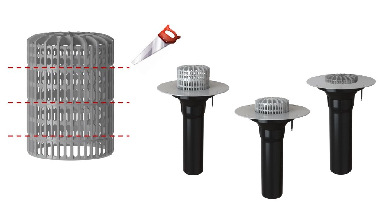 Листвоуловитель предотвращает попадание в дождевую канализацию веток, листвы и других посторонних предметов, а благодаря своему материалу устойчив к погодным условиям. Можно изменять высоту листвоуловителя путем подрезки его нижней части по специальным кольцевым канавкам.