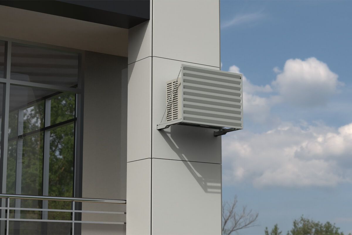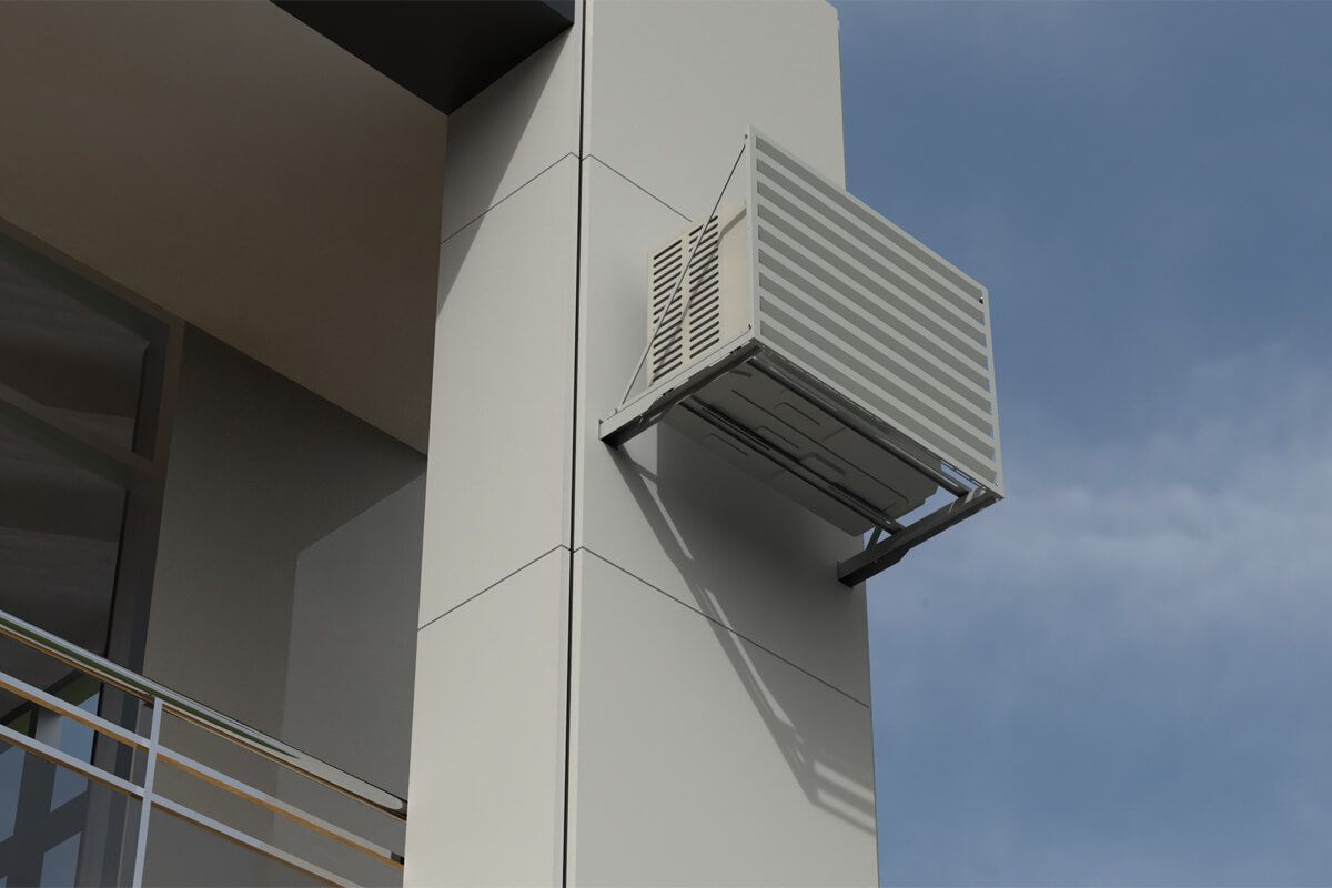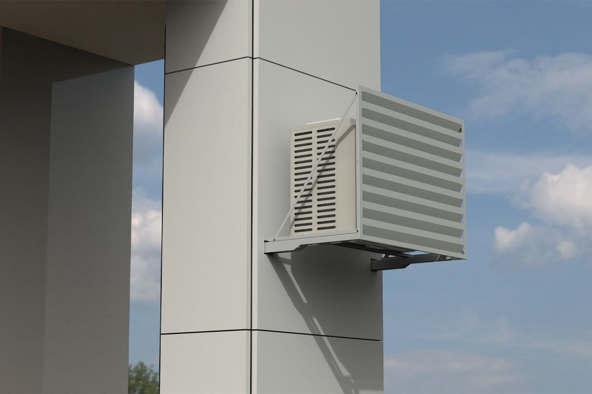Экран для кондиционера Fachmann размером 900х600х550 с перфорацией «Ламели» предназначен для установки на вентилируемый фасад. Он надежно удерживает наружный блок кондиционера, защищая и дополняя внешний вид фасада здания. Кронштейн крепления экрана изготавливается из оцинкованной стали, дополнительно защищается атмосферостойким порошковым покрытием. Кронштейн может быть выполнен под любой тип фасада.